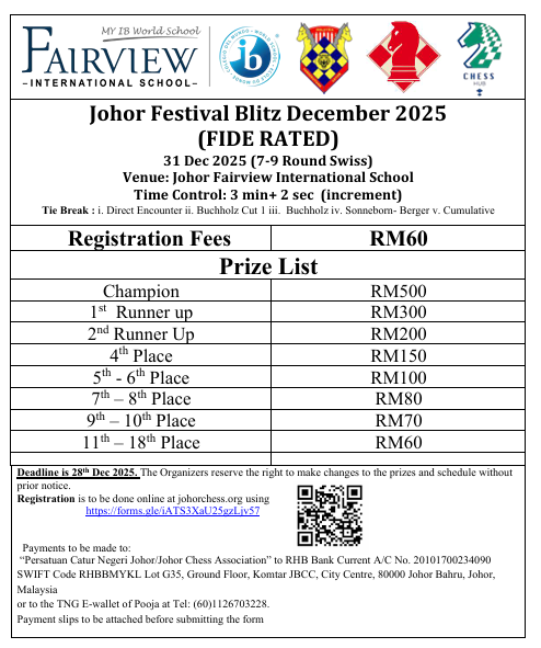 Johor Festival Blitz December 2025By Steven / 20 December 2025 Johor Chess Festival Blitz 2025 (FIDE Rated) Date: 31st Dec 2025 https://forms.gle/iATS3XaU25gzLjv57 Post Views: 334