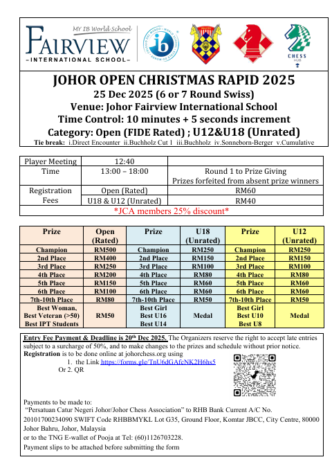 Johor Open Christmas Rapid 2025By Steven / 18 December 2025 https://forms.gle/TnU6dGAfcNK2H6hs5 Post Views: 332